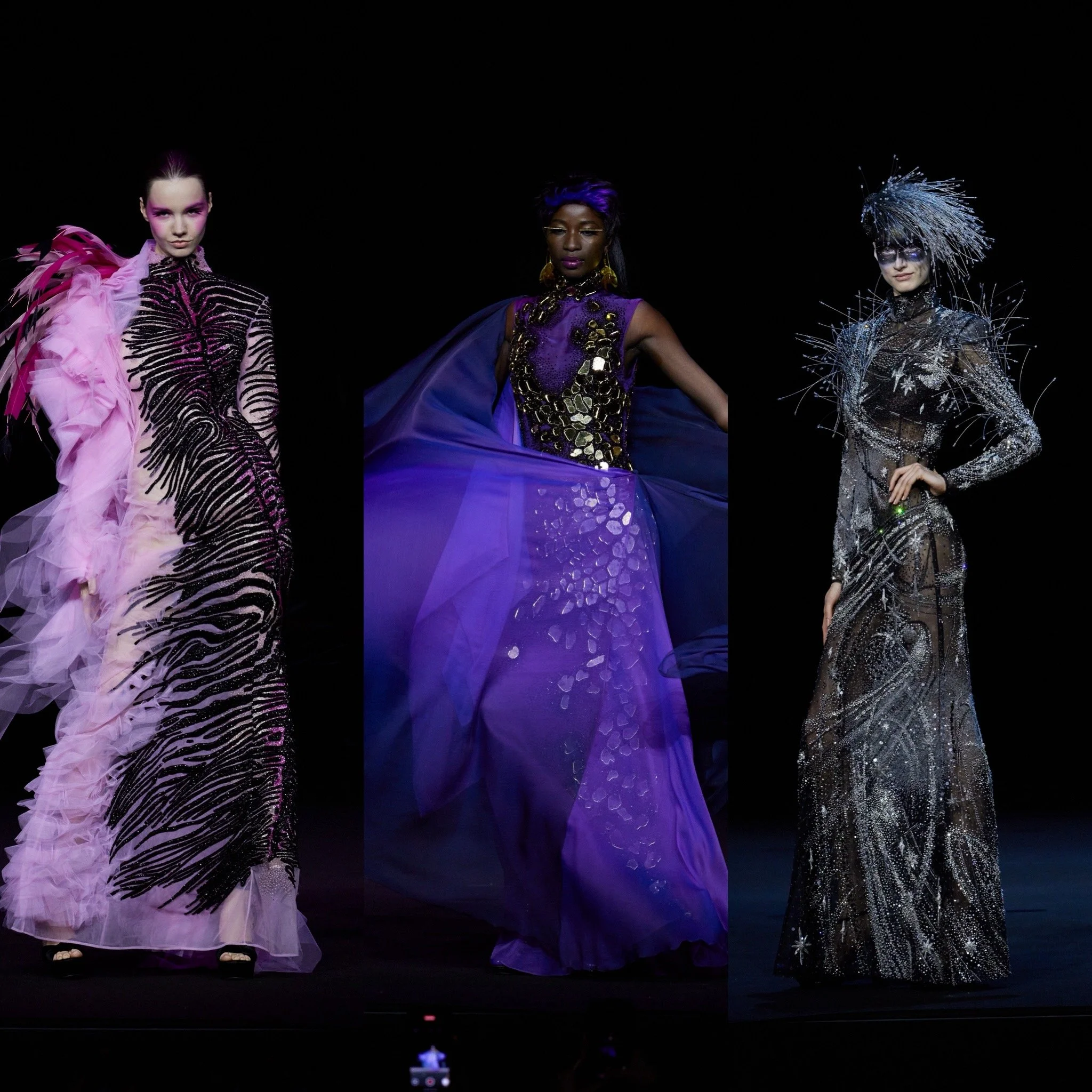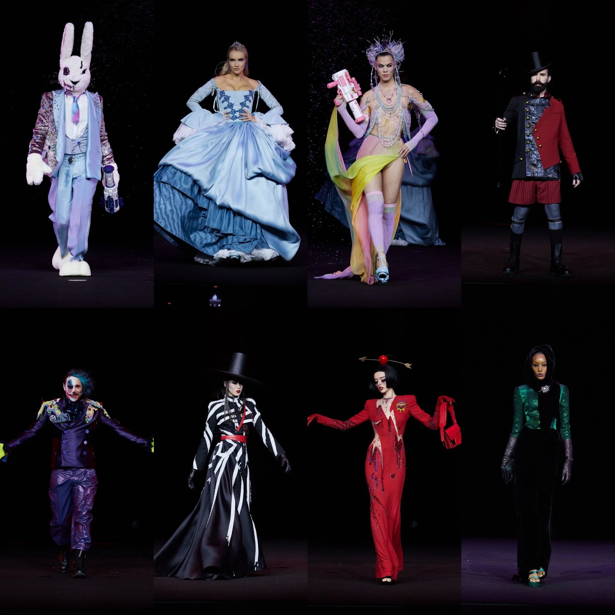 Les silhouettes défilent comme des figures sorties d’un rêve éveillé : héroïnes futuristes, créatures fantastiques, icônes revisitées. Chaque look est pensé comme un rôle, chaque passage comme une scène. La Haute Couture devient alors un théâtre visuel, un espace où tout est possible.