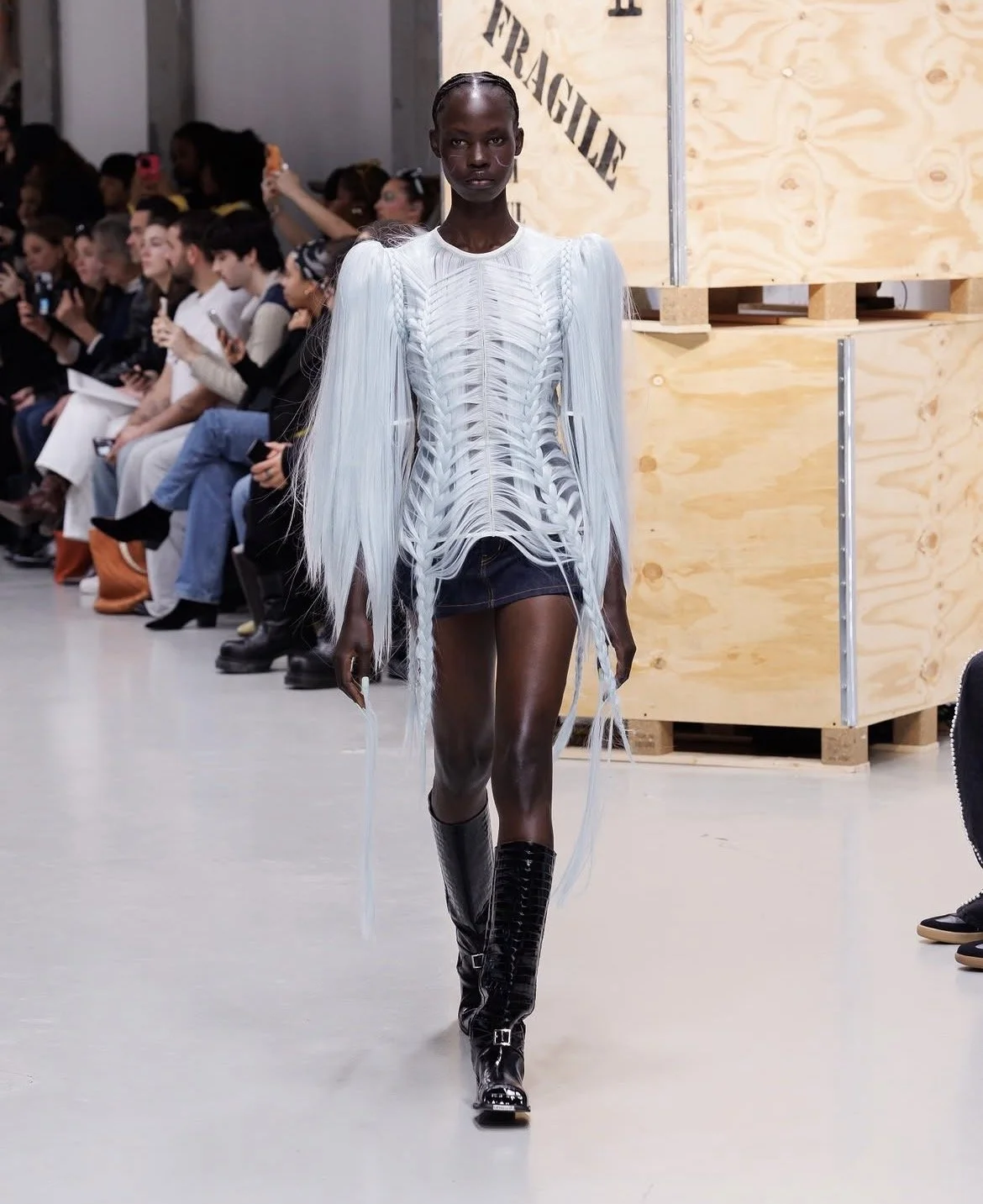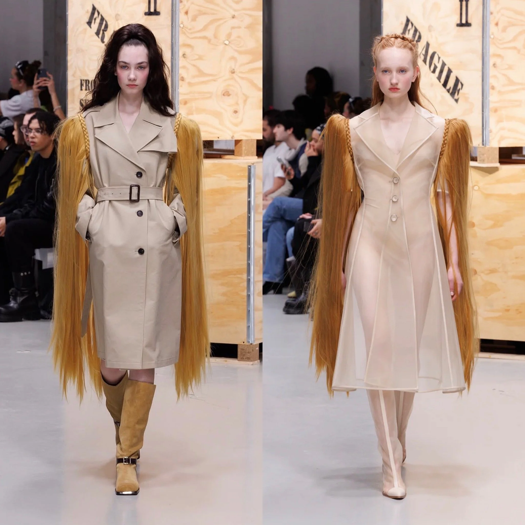 À la Paris Fashion Week Fall Winter 26, KIMHĒKIM signe l’une des propositions les plus conceptuelles de la saison. Sur le runway, l’illusion de longues mèches devient surface textile radicale. Les robes semblent recouvertes de cheveux, comme si le vêtement avait absorbé un attribut du corps pour le projeter à l’échelle de la silhouette.
