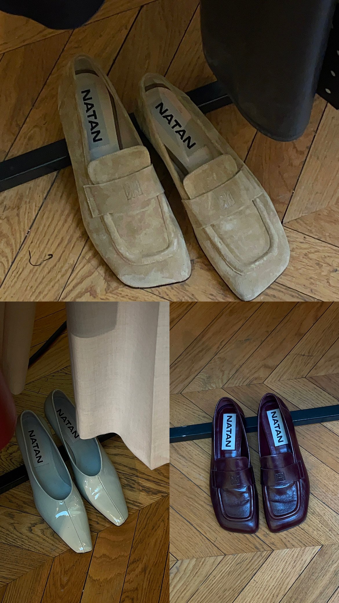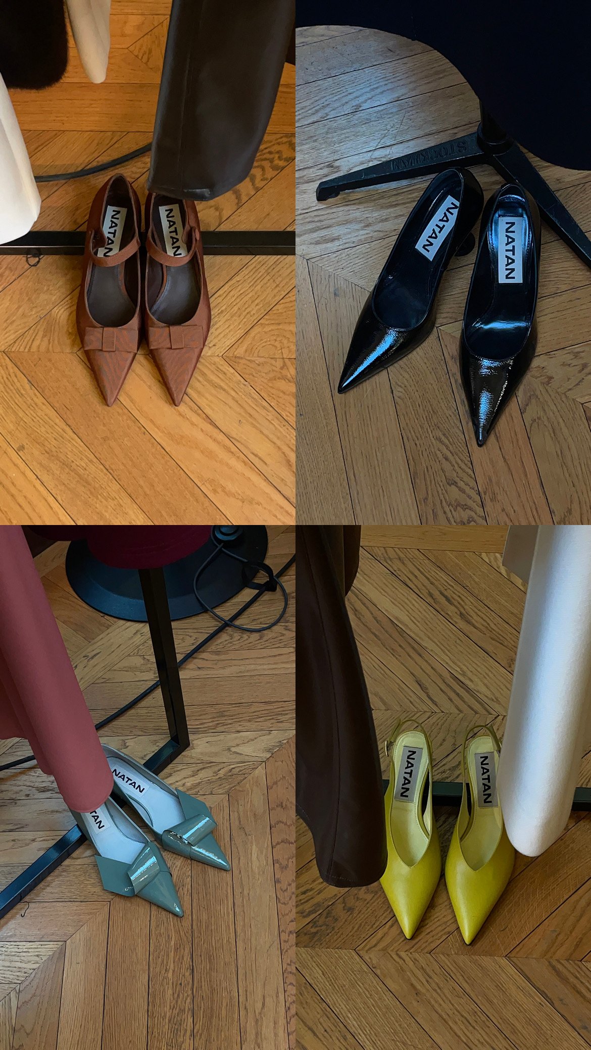 Les chaussures, pièce forte de la collection, confirment l’attention portée aux détails. Escarpins pointus vernis, babies en cuir brun sculptural ou mocassins aux lignes contemporaines prolongent l’esthétique graphique du vestiaire.