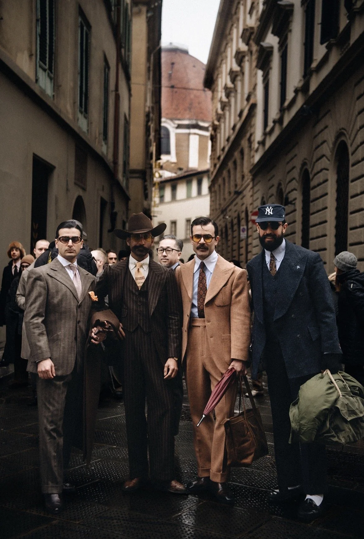Au Pitti Uomo, la rue s’impose comme l’espace central de la mode masculine. Silhouettes observées, photographiées, relayées à l’international : Florence devient un défilé spontané, affranchi des codes imposés. Costumes déstructurés, pantalons amples, contrastes maîtrisés entre pièces sartoriales et éléments plus casual — l’élégance s’y affirme sans rigidité. Les accessoires ponctuent le propos. Ici, le style n’est jamais un uniforme, mais une signature personnelle.