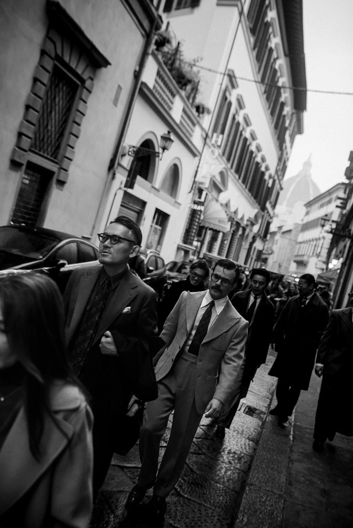 Avant Milan, avant Paris, il y a Florence. À la Fortezza da Basso, acheteurs, créateurs et journalistes se retrouvent pour prendre le pouls des collections homme à venir. Mais au Pitti Uomo, l’essentiel dépasse le cadre du salon. Il se joue aussi à l’extérieur, dans les rues, les cours, les cafés. Le vêtement quitte le statut d’objet pour devenir un geste, une posture, une intention.