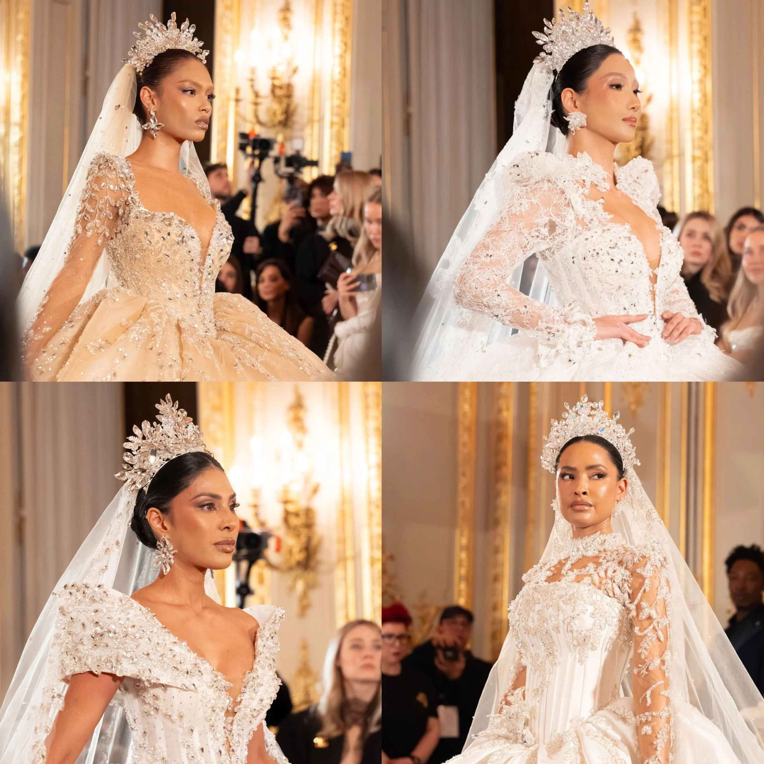 Cette sobriété maîtrisée permettait aux diadèmes et couronnes sertis de cristaux de capter la lumière avec intensité. Les silhouettes prenaient alors une dimension presque royale, évoquant les codes du portrait nuptial classique tout en conservant une modernité résolument couture.