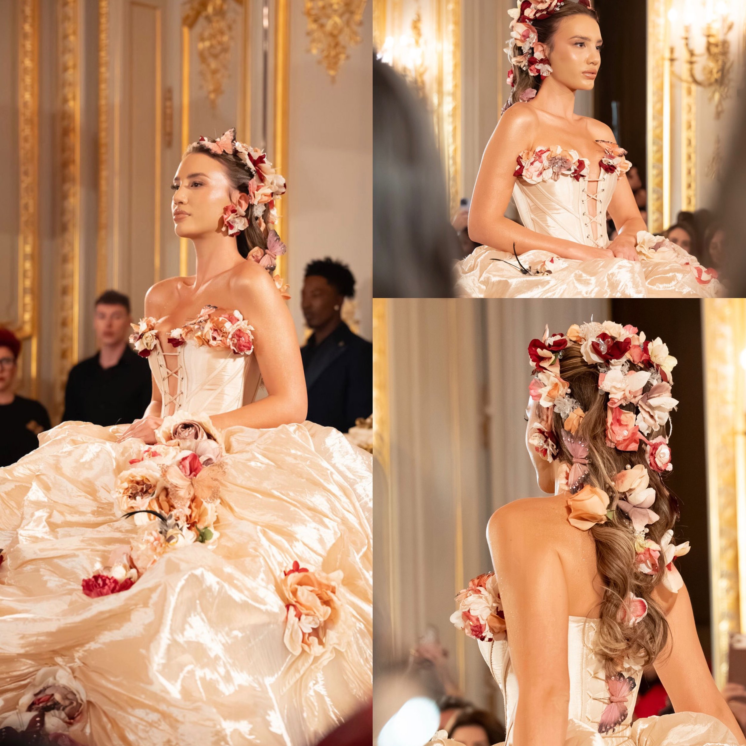 L’effet évoquait une mariée presque onirique, comme surgie d’un jardin en fleurs, où la poésie des éléments naturels vient adoucir la puissance de la couture. Une vision de la féminité romantique, subtilement mise en scène par le travail du détail.
