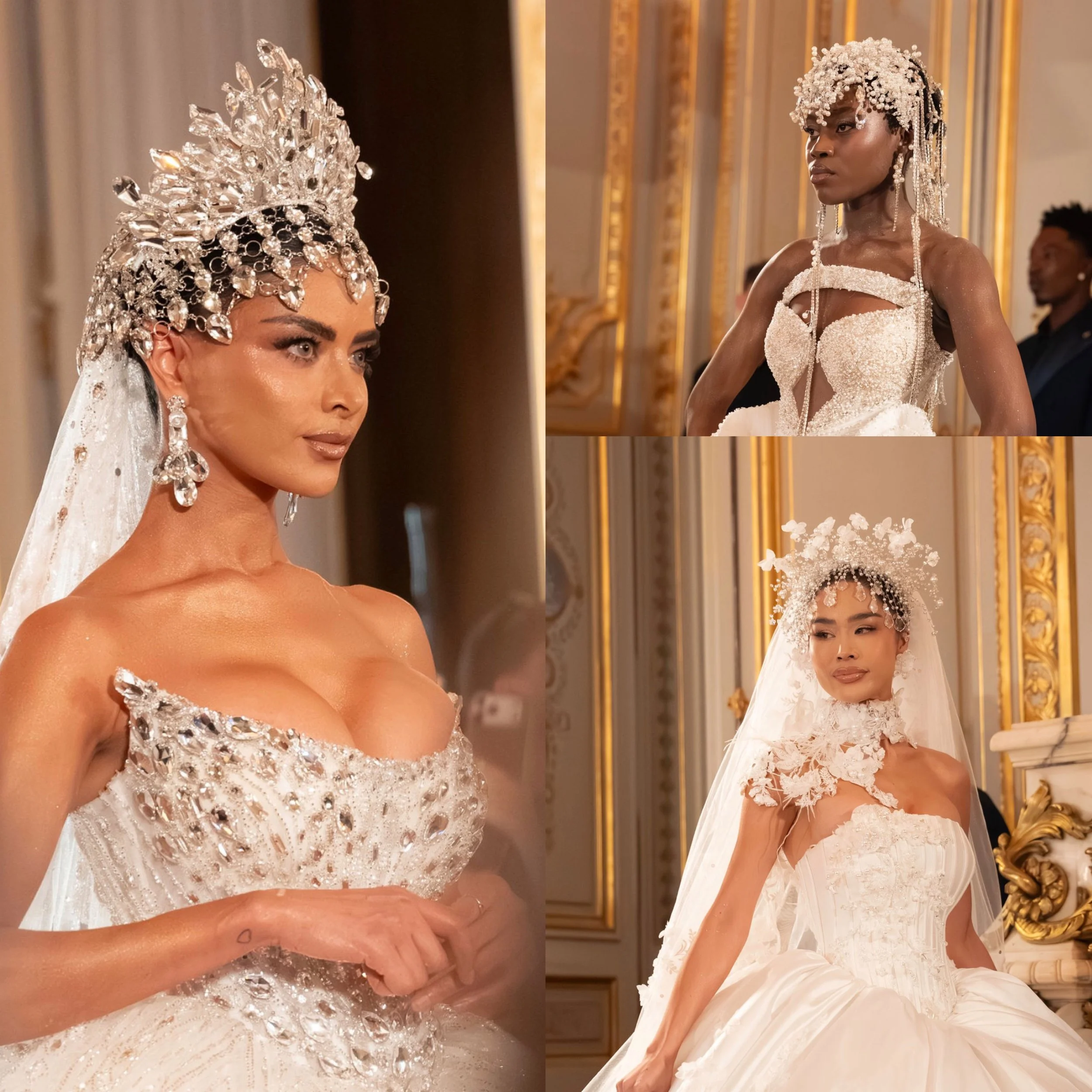 Ces headpieces spectaculaires, composés de branches cristallines, de structures métalliques délicates et de pierres lumineuses, transformaient les modèles en véritables reines modernes de la mariée.