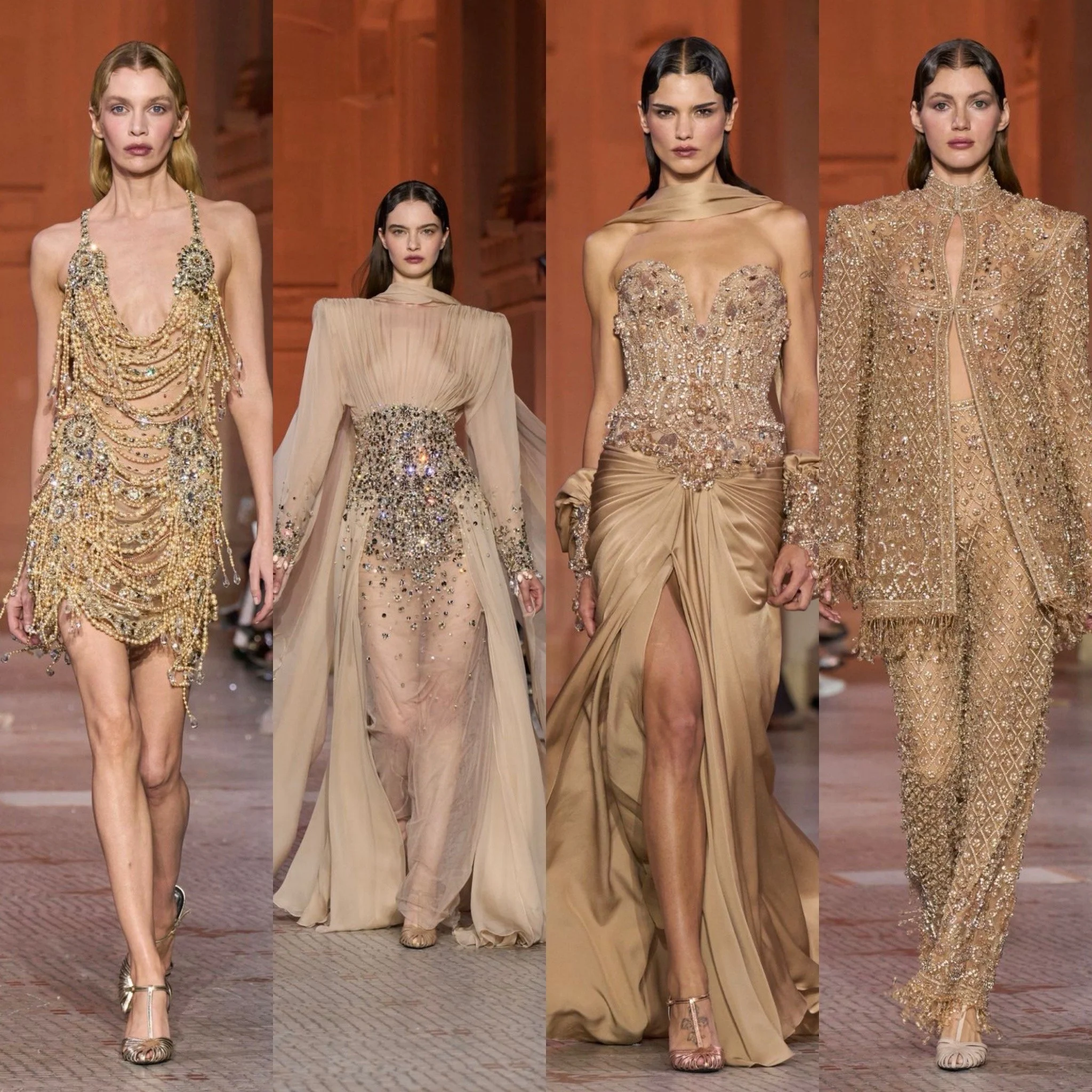 Dès les premiers passages, la lumière est totale. Robes longues brodées d’or, manteaux illusion de fourrure, transparences savamment architecturées : la silhouette capte l’éclat comme sous les projecteurs d’un plateau de studio. Les teintes de brun chaud, de miel et de champagne enveloppent le corps d’une richesse presque cinématographique. La sensualité est assumée, mais jamais abandonnée. Chez Zuhair Murad, la transparence ne fragilise pas — elle affirme.